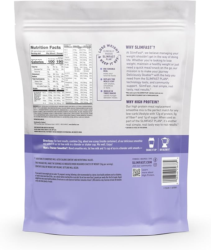 - ON THE GO NOURISHMENT: At SlimFast, we understand that dieting can be hard. With 24 servings, our Smoothie Mix is perfect for on the go, anytime meal replamement. Pack a serving of our smoothie mix with you or keep one at work and one at home, so that you always have a quick, healthy indulgence that will keep you full and help you stay on track wherever your busy schedule takes you