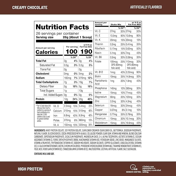 - HIGH PROTEIN SHAKE: SlimFast High Protein Meal Replacement Shakes are the perfect diet friendly smoothie mix. Each serving is packed with 12g of Protein and 20g of Protein when combined with 8 oz of Fat Free Milk to keep you full for hours with a decadent rich and creamy chocolate flavor to satisfy your sugar cravings