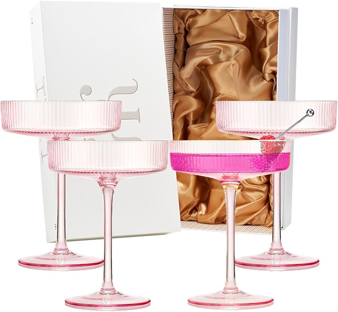Khen Ribbed Vintage Art Deco Coupe Glasses - Martini, Champagne & Cocktail Ribbed Glasses 8oz | Cute Crystal Glassware Sets, Pink, 4 Pieces, Housewarming Gifts