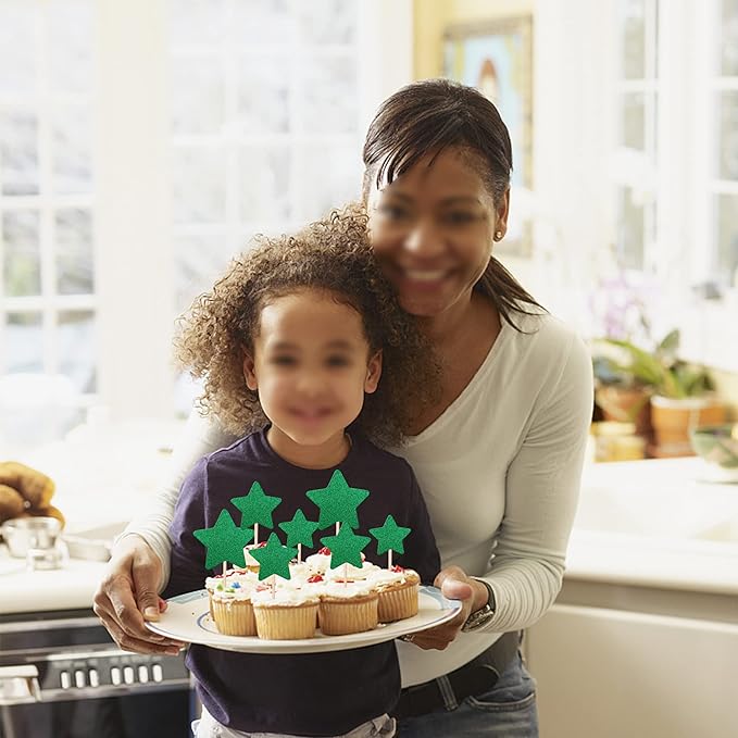 30 PCS Star Cupcake Toppers Glitter Assembled Twinkle Star Cupcake Picks Wedding Engagement Bridal Shower Birthday Party Cake Decorations Supplies Mixed Size Green