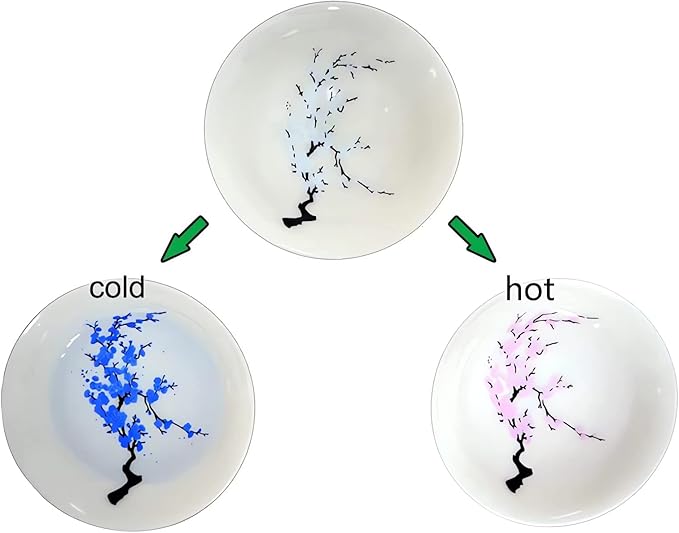 - 🍶🍶【 Magical Sake Cups 】 Pour a cold(below 71°F/22°C)/hot(above 113°F/45°C ) drink into this Magic Sakura Sake Cup and the cherry/peach/plum blossoms will be in full bloom! ! Sakura sake cup color change occur when the sake cups temperature goes below or above temperature required.