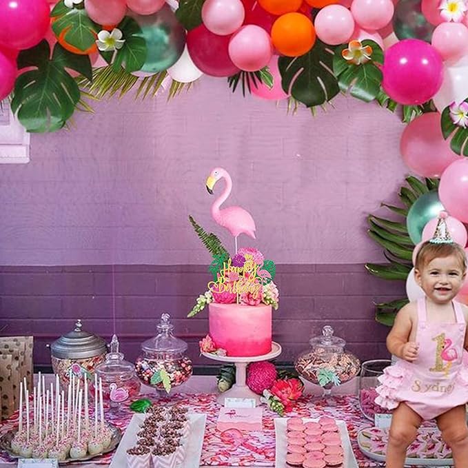 Rsstarxi 1 Pack Flamingo Happy Birthday Cake Topper Glitter Flamingo Cake Decoration Palm Tree Turtle Leaf Flower Flamingo Cake Pick for Tropical Hawaiian Luau Baby Shower kids Birthday Party Decor