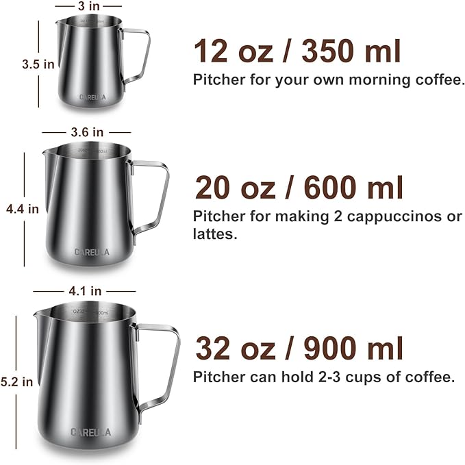 - Different Size For Frothing & Latte Art: Our espresso pitcher is perfect for any coffee lover. Use small milk cup for espresso or large milk jug for making 3-4 portions of any coffee beverage.