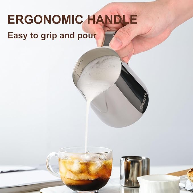 - Humanized Design & No More Leaks: Our frothing pitcher are designed with a firm, durable weld joint between the cup body and handle. The handle provides a secure grip and allows for easy pouring and control. Our point-mouth design prevents liquid from leaking out of the milk steamer cup, ensuring that your coffee pattern stays pretty.