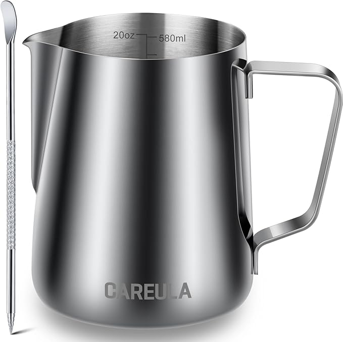 - Perfect Espresso Accessories: The milk frother jug can be used in different ways: froth or steam milk for lattes; measure liquids; serve milk or cream. With a bonus latte art pen, you can create beautiful design coffee that will impress your friends and family.