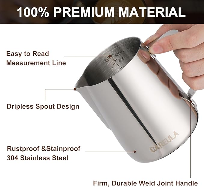 - Humanized Design & No More Leaks: Our frothing pitcher are designed with a firm, durable weld joint between the cup body and handle. The handle provides a secure grip and allows for easy pouring and control. Our point-mouth design prevents liquid from leaking out of the milk steamer cup, ensuring that your coffee pattern stays pretty.