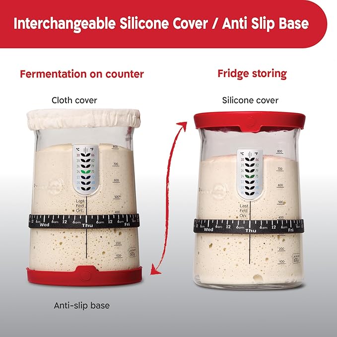 - Experience The Ultimate In Sourdough Care - Our starter kit comes with a silicon cover for fridge storage that doubles as unti-slip base for your kitchen counter during fermentation while using the cloth cover.