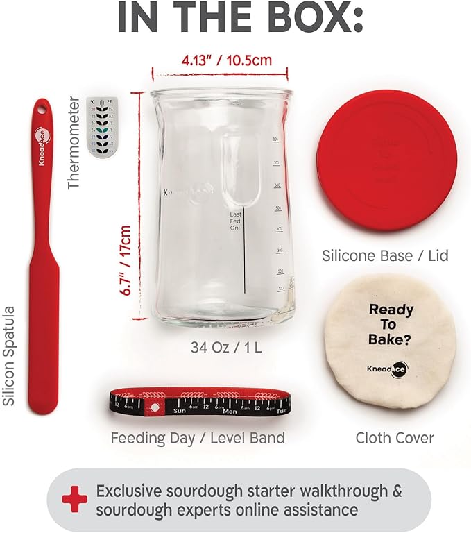 - Essential Addition To Your Bread Making Tools & Supplies - This sourdough jar kit comes complete with volume, net weight & feed line marks, thermometer, cloth cover, silicone cover/base & spatula.