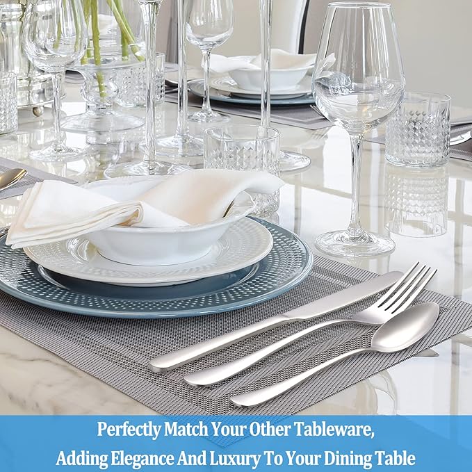 - 【Proper Weight And Comfortable Handle】: Unlike other brands, the curvature of our spoons silverware handles is designed according to the posture of the hand, and the appropriate weight and perfect balance are added to ensure maximum comfort during use that avoids you feel tired. Moreover, the smooth edges ensure safety and no scratches.