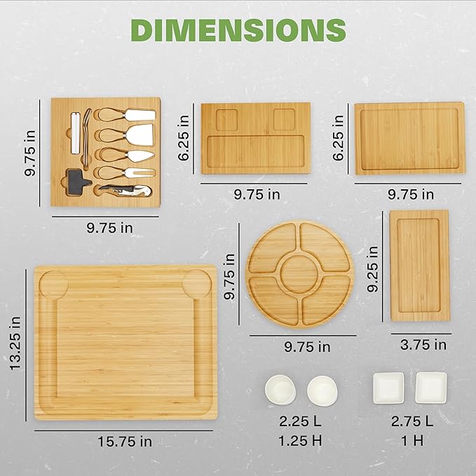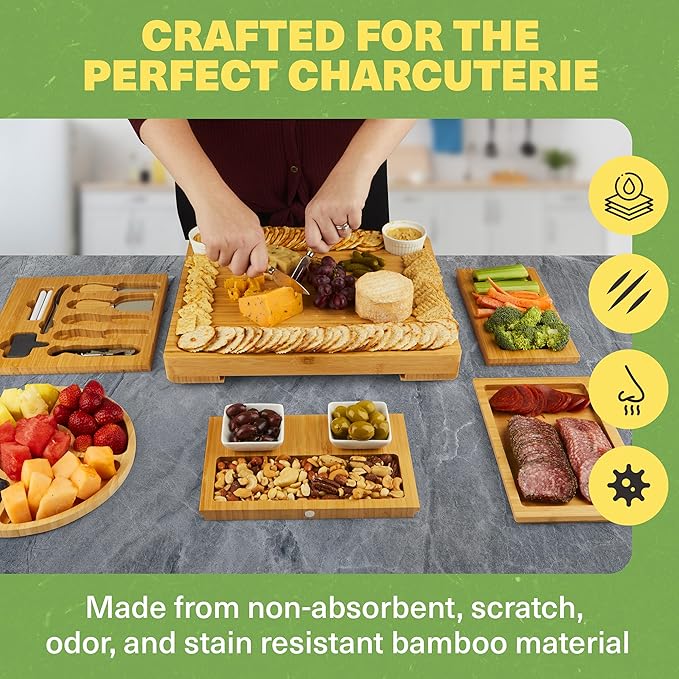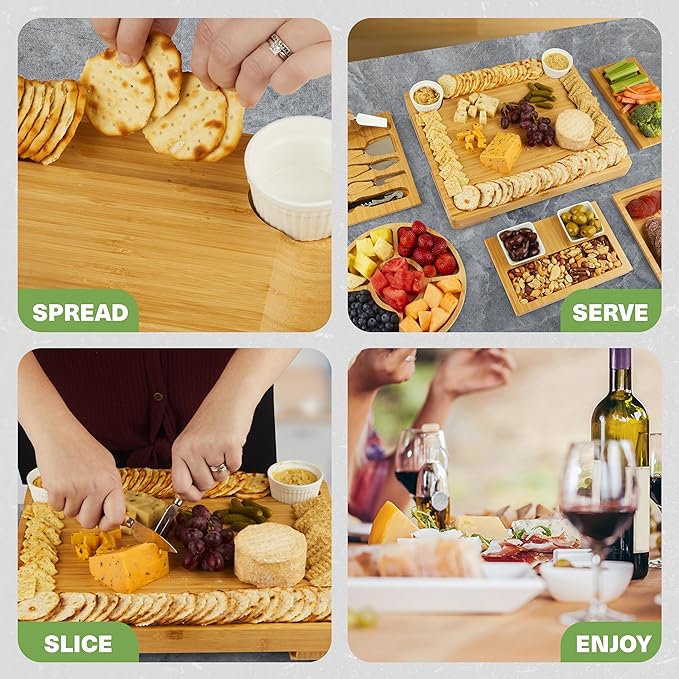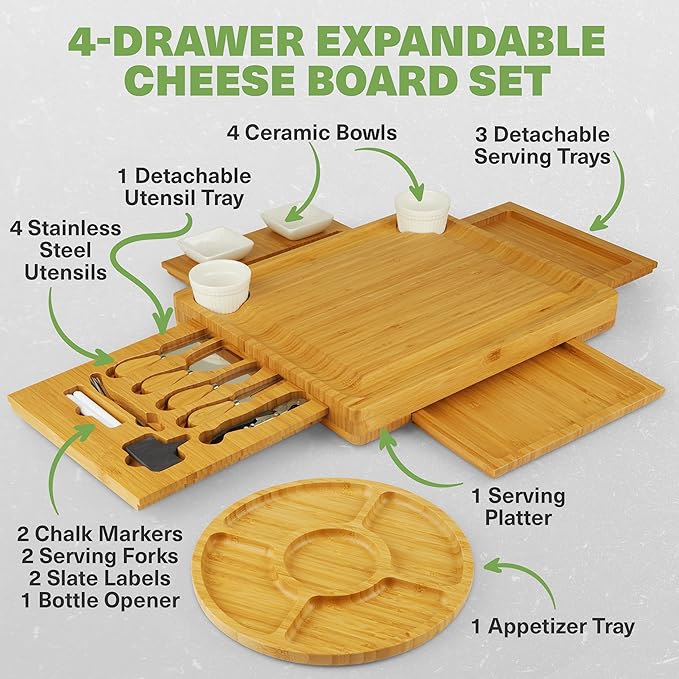 - Complete Set: Includes 4-drawer expandable cheese board with 4 stainless steel utensils, detachable tray, 4 ceramic bowls, 3 serving trays, platter, appetizer tray, markers, forks, labels, and opener