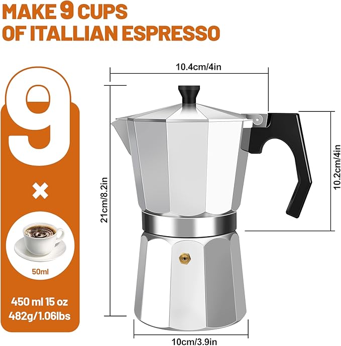 9 Cup Aluminum Espresso Stovetop Moka Pot Express Coffee Maker Percolator Italian Classic Mocha Coffee Machine for Italian and Cuban Cafe Brewing for Home & Camping 450ml 15oz