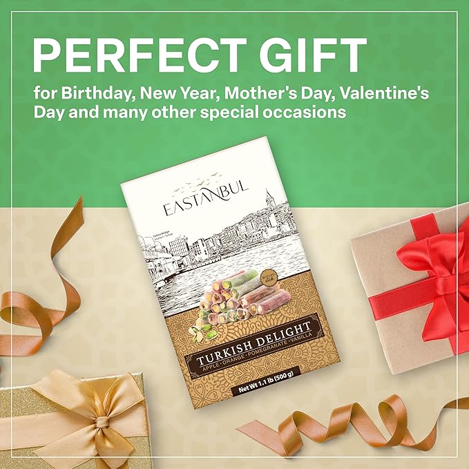 - HEALTHY & PREMIUM INGREDIENTS: No Artificial coloring, Glucose, Corn Syrup, or Fructose. Our authentic Turkish Snack Box is vegan, gluten-free, and produced with natural, non-GMO ingredients. Moderately sweetened with top-notch quality beet sugar from the finest local providers from Turkey and made with natural Apple, Orange, Pomegranate, and Vanilla flavors. Each deserves a distinct appreciation. Generously contains 40% premium pistachios. Suitable for those watching their calorie intake