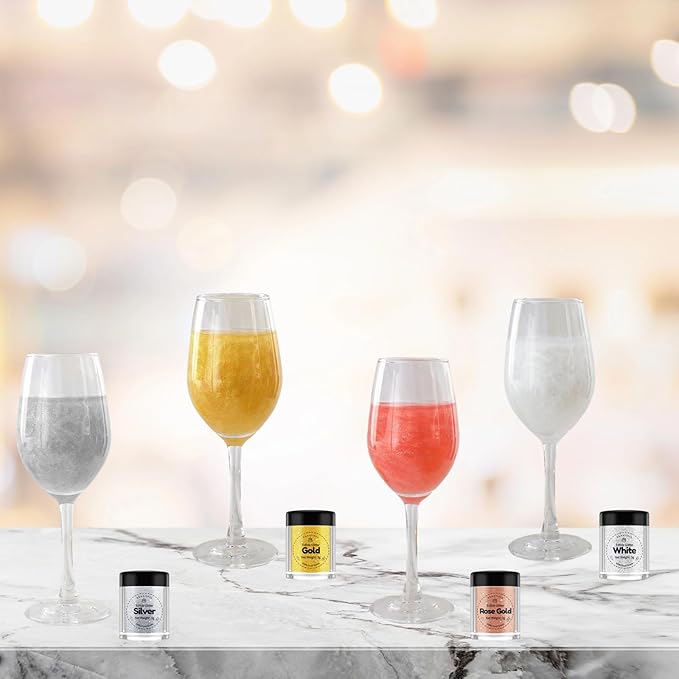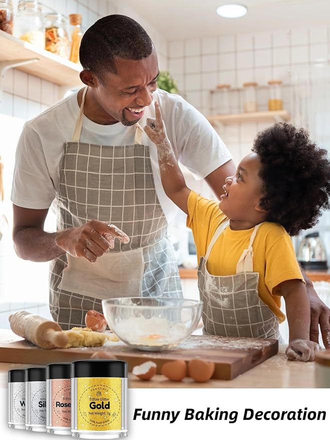 - 【4 Colors Edible Glitter Set】Chosen the top-sales color composition with, Includes Gold, Rose Gold, Silver and White, 3g per bottle, Total 12g per set.