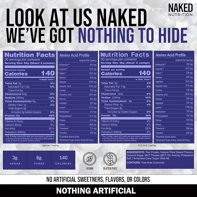 - SUPERIOR PLANT PROTEIN: Dairy-Free and vegan-friendly – made from yellow split peas grown in the USA and Canada. Blueberry Muffin Naked Shake offers a complete amino acid profile, making it the ideal source of fruit flavored protein powder.