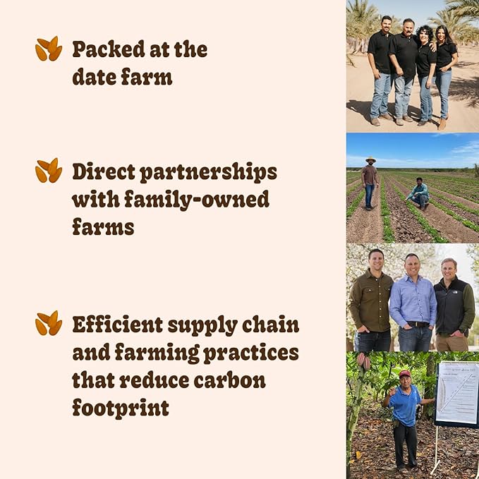 - FARM TO TABLE: Our organic Medjool dates are grown, harvested, pitted, and filled with natural almond butter and from our sustainable family-owned date farm!