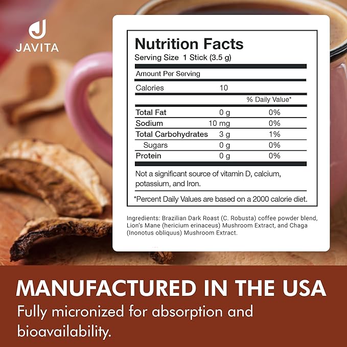 Mushroom Coffee by Javita, Immune & Defend Blend of Chaga, Lion's Mane and Dark Roast Coffee for Morning Boost, Antioxidant Support; Keto-friendly, 1 box of 24 (3.5 g) Sticks, 24 ct