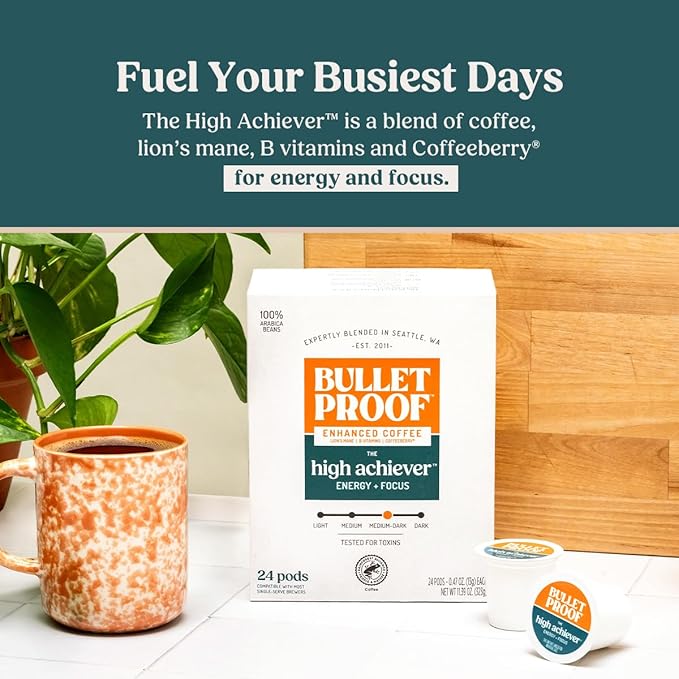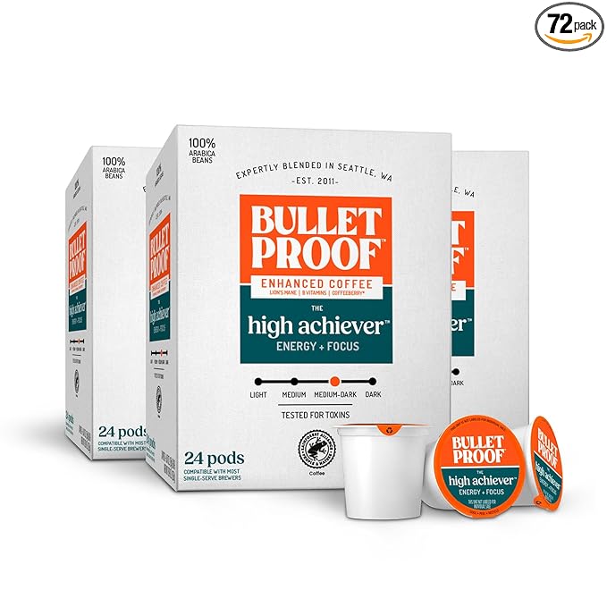 Bulletproof The High Achiever Single-Serve Pods, 72 count, Medium-Dark Roast Enhanced Coffee with Lion's Mane Mushroom, B Vitamins, and Adaptogens for Energy and Focus
