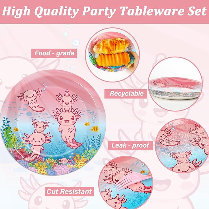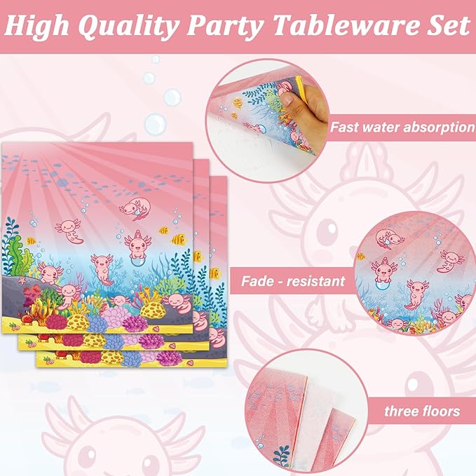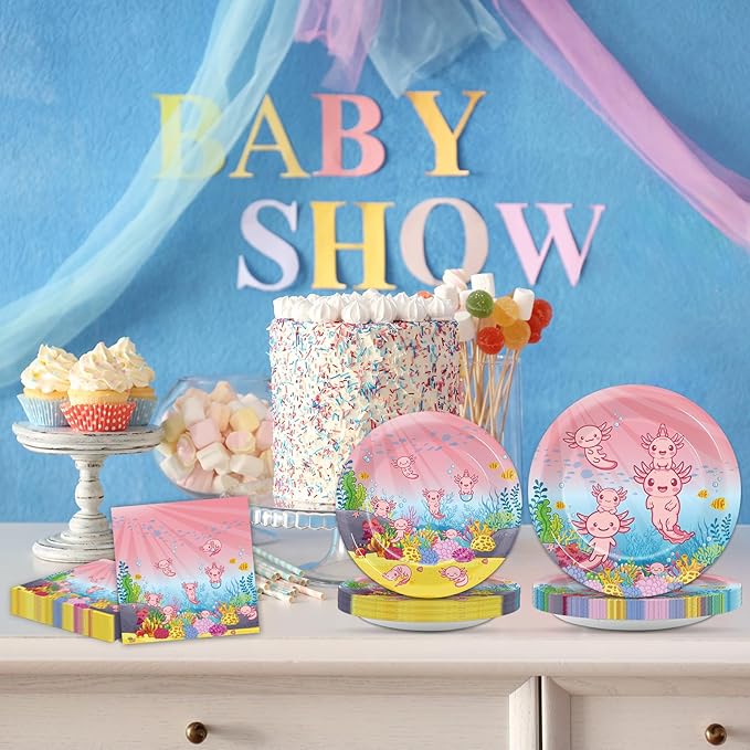 - 【Birthday Party Table Settings】These Axolotl birthday tableware kits can serve 24 guests, enough quantity for Baby Shower theme big day . These Pink Axolotl party decoration kits will make your table settings look fantastic and all your guests will be happy.
