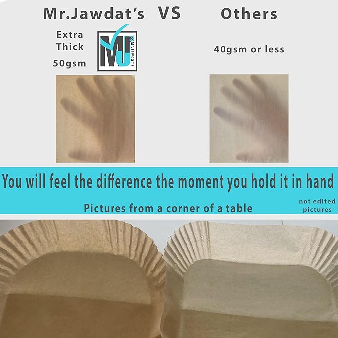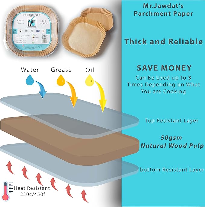 ((Extra Strong)) Air Fryer Disposable Paper Liner 100Pcs, Mr.Jawdat's Strong AirFryer Liners, Non-Stick Liner for Air Fryer and Microwave, Free of Bleach (Square, Bottom Size 7.9inch)