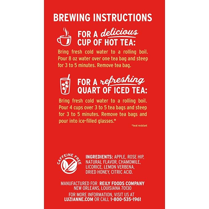 - Tea with a Southern Accent, introducing Luzianne Southern Blend Honeyed Peach Herbal Tea Bags for hot or iced tea, southern style; Includes (1) 18-Count box of tea bags