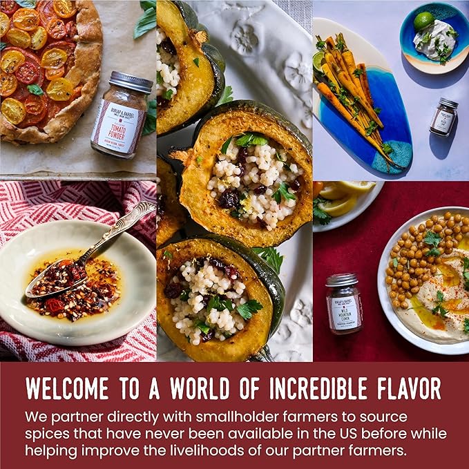 - Spices: Sun-Dried Tomato Powder, Wild Mountain Cumin, Purple Shallot Powder, Ground Black Lime, and Zanzibar Black Peppercorns (in a removable grinder-top jar)