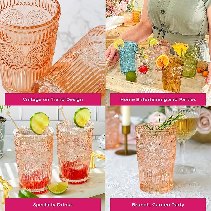 - Sweet tea glasses, Water glasses, iced coffee cup, juice cups, these are great for any cold drink from cocktails to mocktails and even beer! With a nice weight they feel great in your hand and look even better! The retro boho esthetic is sure to make all your guest where you got them from!