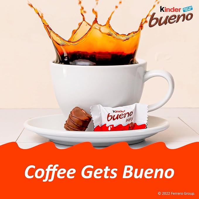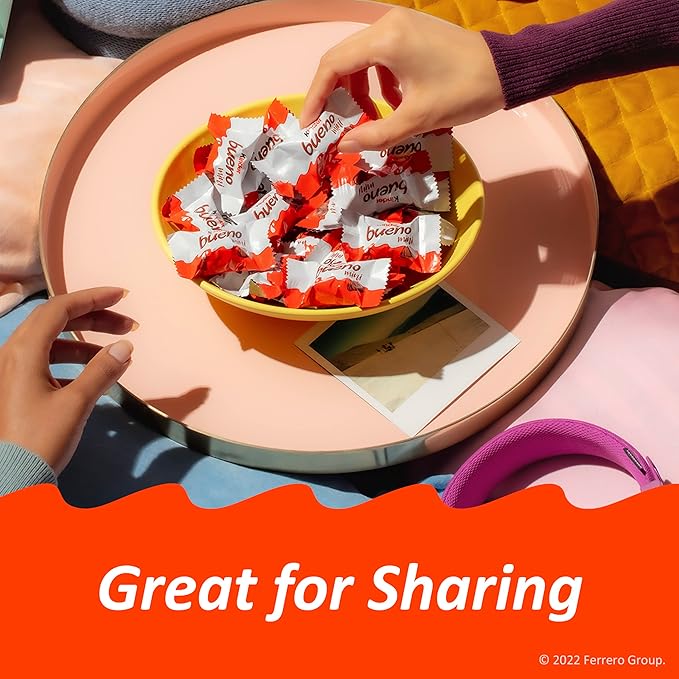 - TREAT YOURSELF: Make an ordinary moment extraordinary by adding the crispy, creamy deliciousness of a Kinder Bueno milk chocolate Mini to a candy dish, lunch bag or as party favors. These minis are perfect for enjoying with friends or family. You can also make your desserts and baked goods more delicious by topping them with Kinder Bueno Mini.