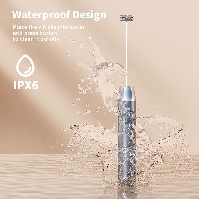 - One-button Operated Design: One press to start the whisking and another press to stop frothing. Just place the LunaFro handheld milk frother’s whisk into the container with milk or other liquid food, then press the button to make milk foam, and press the button again to stop working. It’s effortless to clean. Only put the mixing head into water or soapy water, and then press the button to let eddy water current clean it completely.
