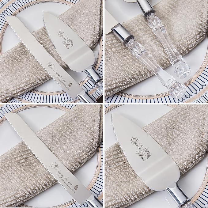 - 🍰Pure/Engraved Knife Sets- Classic 2pcs cake knife sets, solid silver, 'Mr Mrs', 'Let's eat cake together forever', 'Mis Quince Años' innovative engraved design, and 20+Personalized designs for customized, choose your favorite design for a unique gift.