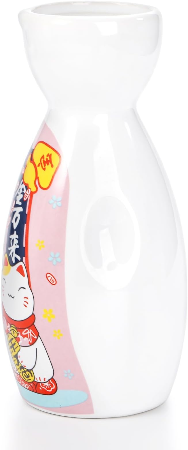 - ๐๐๐ฅ๐ฎ๐ ๐๐๐๐ค: This Japanese maneki neko ceramic sake set comes with 4 cups and 1 serving carafe, which are packed safely in a shockproof box. The bottle measures 5 inch high, holding approximately 6 OZ. Each cup measures 1.8" Dia * 1.8" H. The whole set is affordable and perfect in daily use.
