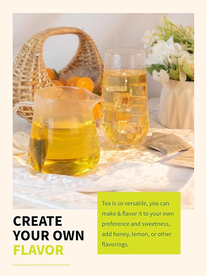 - [100 COUNT ECO-CONSCIOUS TEA BAGS] - Our premium tea bags are made from 100% corn fiber, and tea bags are unbleached and compostable. No string and no tag. No extra waste - just healthy & delicious tea!
