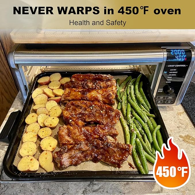 - SAFE UP TO 450℉: The 2pcs cookie sheets resist bending or bursting even at 450℉, has even heat distribution, resists warping and stays durable. Perfect choice for baking with Breville Toaster Oven.