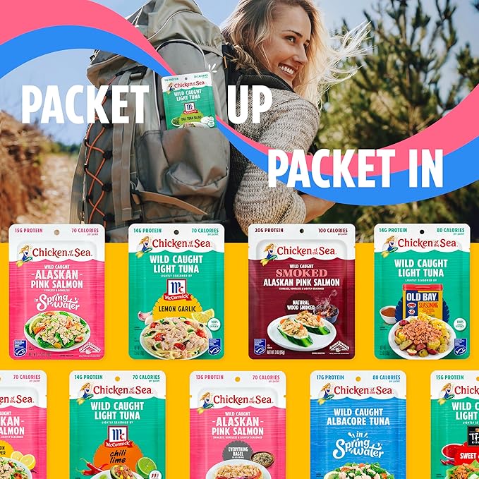 - HIGHLY NUTRITIOUS: Wild caught salmon contains a wide range of essential nutrients, including protein, vitamin D, and heart-healthy omega-3s. Each packet of Chicken of the Sea Alaskan Pink Salmon with Everything Bagel Seasoning contains 13 grams of protein, 1 gram of total fat, and 2 grams of carbs—ideal for keto, paleo, and Mediterranean diets. It’s an excellent addition to any healthy, active lifestyle.