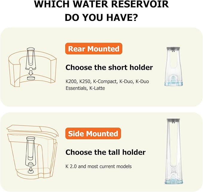 - Incompatible: Only compatible with the Side Reservoir and is not compatible with the following models: K200/K250, K-Compact, K-Duo, K-Duo Gen2, K-Duo Essentials, K-Latte, K-Classic (old), K-Elite (old) and all 1.0 brewers (B Series/K Series/Vue/Rivo)