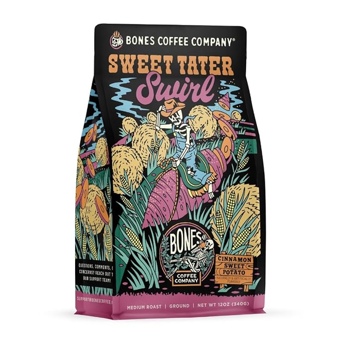 Bones Coffee Company Sweet Tater Swirl, Cinnamon Sweet Potato Flavored Coffee, Medium Roast Low Acid Arabica Beans Compatible with Auto drip and French Press Coffee Maker, 12 Oz Ground