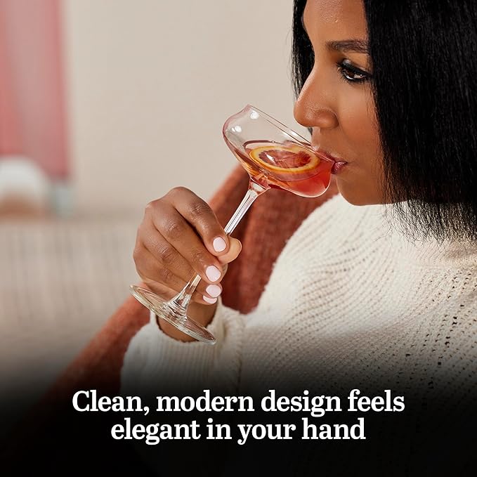 - Coupe Glass Set: The Stratford cocktail coupe glasses set of 4 features artfully curved bowls that elevate fine wines and cocktails; crafted for clarity and brilliance, the 6.75 oz coupe wine glasses exude lavish luxury and contain 4 cocktail glasses