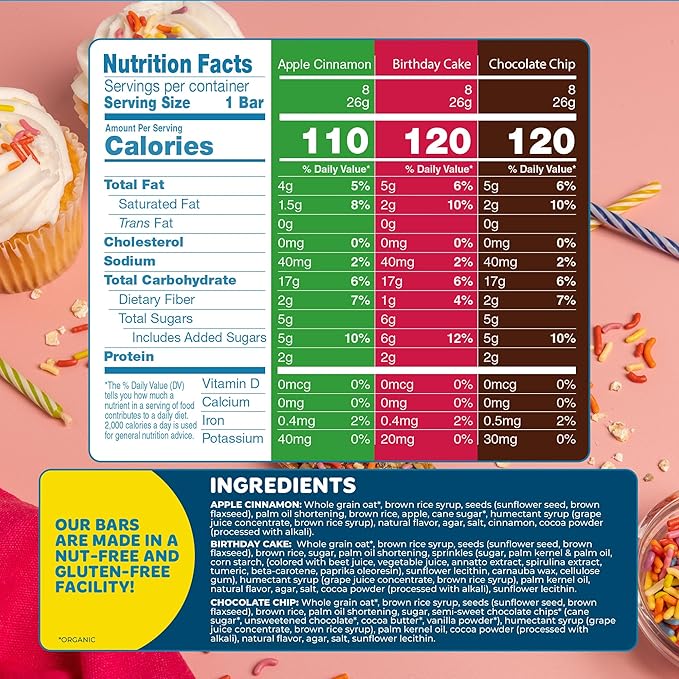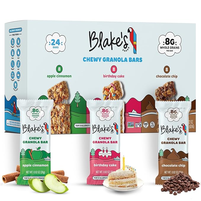 - Allergy Free Snack Bars Just Got Exciting – Blake’s 24 granola bars bulk pack features 3 kid-approved flavors - (Chocolate Chip, Birthday Cake & Apple Cinnamon) individually wrapped and great for adding variety to lunchboxes, even for picky eaters