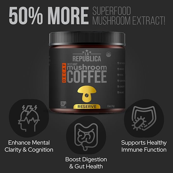 - Elevate Your Coffee Experience – La Republica’s RESERVE DECAF instant mushroom coffee combines rich, chocolaty flavors with powerful health benefits. Known as the best mushroom coffee, it supports energy, focus, and digestion, making it ideal coffee substitute as a mushroom coffee for bloating and gut health.