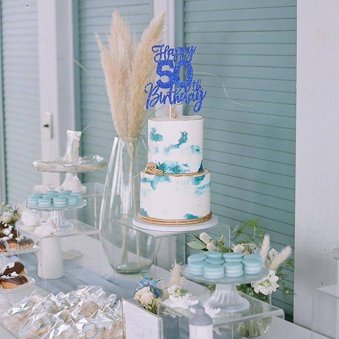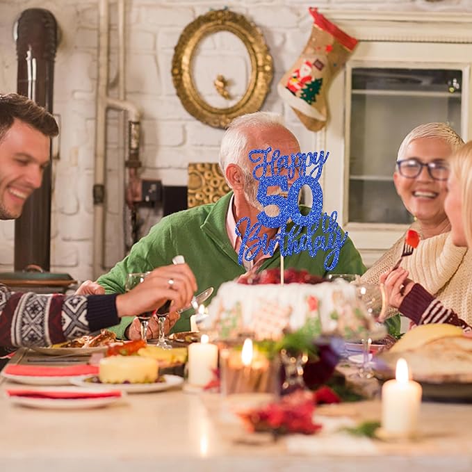 1 PCS Happy 50th Birthday Cake Topper Glitter Cheers to 50 Years Birthday Cake Pick Fifty Hello 50 Fabulous Cake Decoration for Happy 50th Birthday Anniversary Party Decorations Supplies Blue