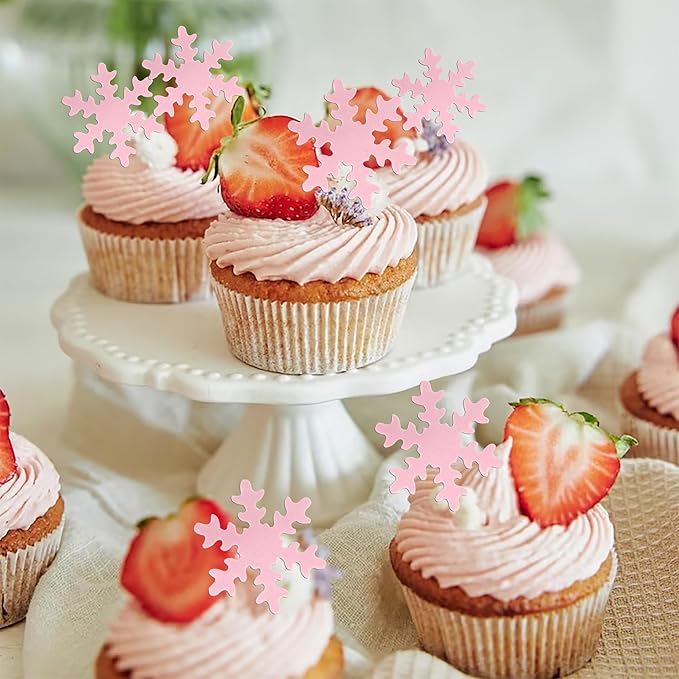 Rsstarxi 50 Pack Pink Edible Snowflake Cake Decorations Snowflakes Cupcake Toppers Winter Frozen Snowflake Cake Decorations for Baby Shower Kids Birthday Winter Party Decorations