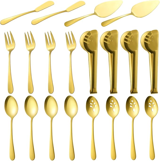 - 【Great Value 20 PCS Gold Serving Utensils】 BEWOS 20-Piece gold serving utensils set includes 4 large gold serving spoons, 4 slotted serving spoons, 4 serving forks, 4 serving tongs, 2 butter knife and 2 cake server. A variety of serving utensils can almost meet your daily and party needs, with much better quality than plastic utensils, affordable and reusable