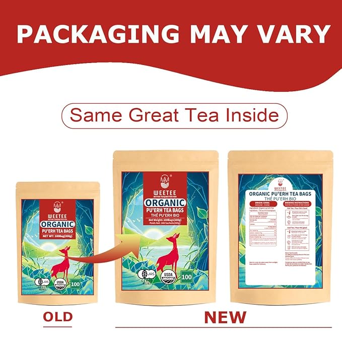 WT WEETEE Organic Puerh Tea Bags, Organic Ripe Pu'erh Tea 100 Count, Smooth, Subtly Sweet, Earthy Dark Tea Black Tea, Rich Antioxidants