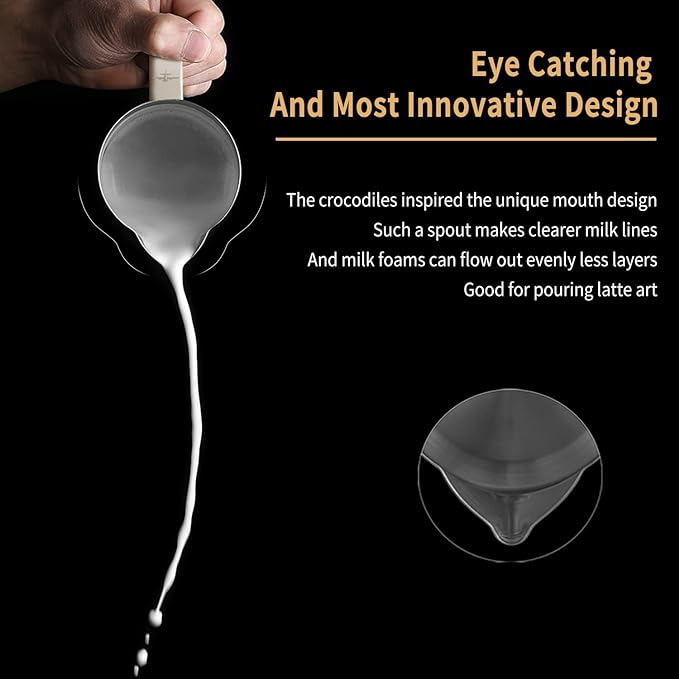 - Crocodile Spout and a Double Diversion Trench: The milk is released in plenty and making the second period of oscillation simpler by the front and back double-arced diversion trench of the frothing pitcher spout. The swing lines are more distinct thanks to the unique crocodile spout design, and you may create more pattern you like.