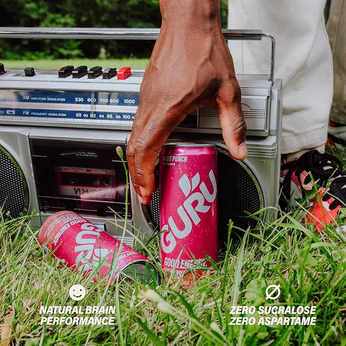 - 140 MG NATURAL CAFFEINE THAT LASTS: Use as pre workout drinks or anytime you need a pick me up. GURU Fruit Punch 12oz has 140mg of caffeine per can and supports increased concentration, physical vitality, and provides sustained energy with naturally occurring caffeine from green tea.