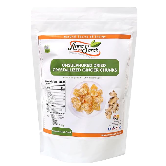 - DRIED UNSULPHURED CRYSTALLIZED GINGER: Health booster chunk ginger slices. Sweet, spicy, moist and chewy taste.