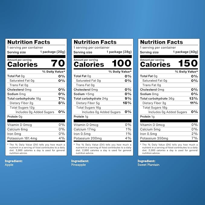 - INCLUDES 8 single serve resealable bags of Baked Fruit Snacks: 2 Sweet Plantain Banana (1.4 oz), 2 Pineapple (1 oz), 2 Apple (0.7 oz).