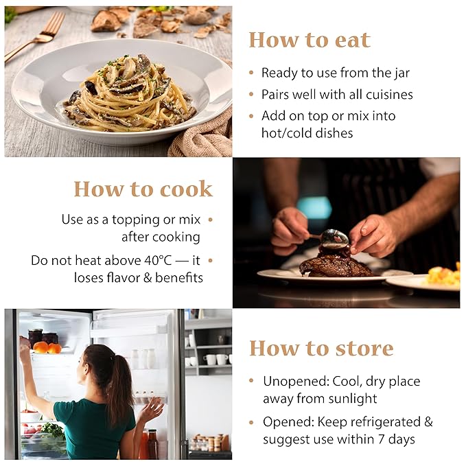 - Easy to use, easy to store: Use our truffle sauce as a finishing touch—just a spoonful on warm pasta, risotto, eggs, or toast is enough. Do not overcook or heat it above 40°C, as this can diminish its flavor and reduce its beneficial properties. Add it after cooking. Store in a cool place. Once opened, keep it in the fridge and finish within 7–10 days for best taste.