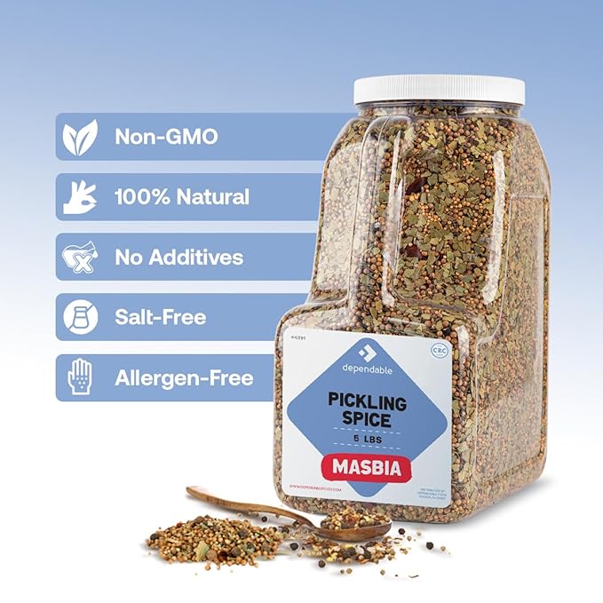 Dependable Food Pickling Spice - 5 Lb. Jar - Bulk Size - Kosher Premium Pickling Seasoning for Chefs & Restaurants - Non-GMO Pickling Spice Mix for Vegetables, Corned Beef, Canning Pickles, & More - Flavorful Pickle Spice