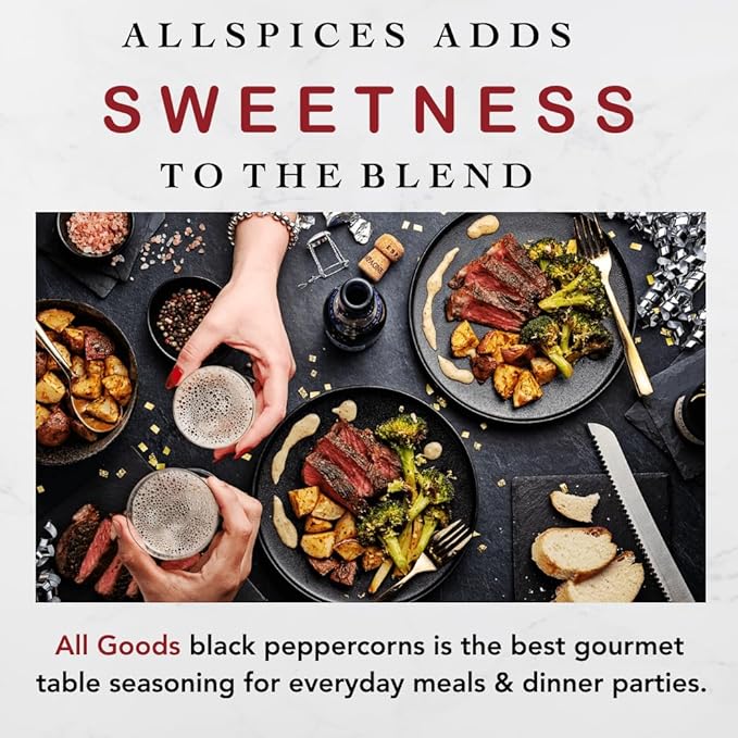 - ✔️VERSATILITY IN THE KITCHEN: With All Goods black peppercorn, unleash your culinary creativity, impress all your guests with delicious flavor & made them happy belly. Real coarse ground black pepper, peppercorn grinder for seasoning all your dishes.