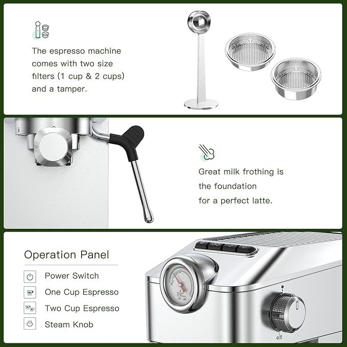 Espresso Machine 20 Bar - Stainless Steel Silver Coffee Maker for Home & Office, Compact with Fast Heating, High-Pressure & Removable Water Tank for Coffee Lovers